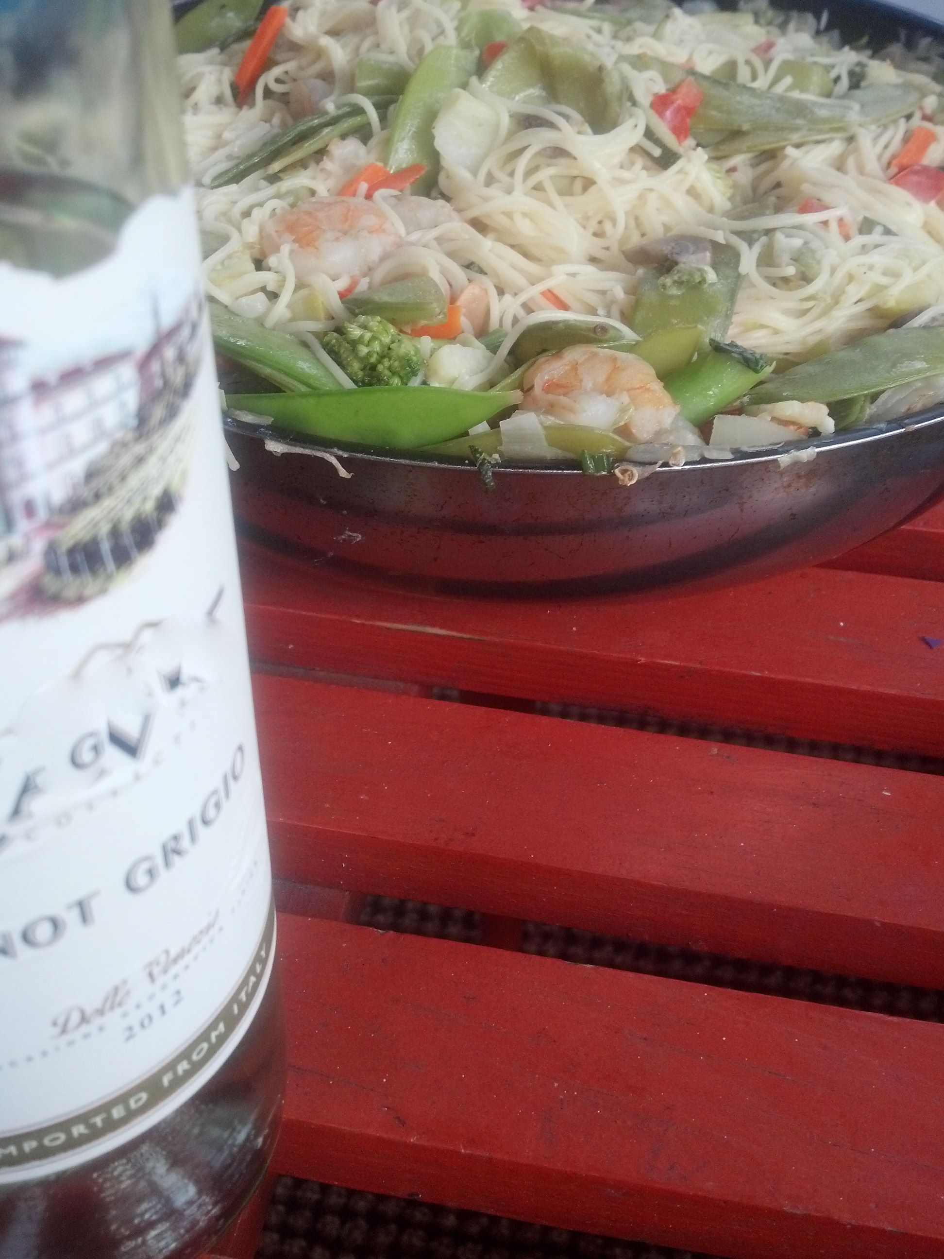 This time of year, this type of dish comes to mind; fresh vegetables always remind us of spring. We like to toss together a combination of vegetables and mix it together with some pasta and wine and have a light meal. Shrimp is a nice touch as well. However, this time we went a little berserk in the vegetable aisle of the supermarket and decided to add pretty much everything that came to mind. At one point during the cooking we felt some concern that there were too many vegetables as they seemed to be piling over the edge of the pot and the pasta had yet to be added (thus the “extravaganza” in the name, and it was no longer what one would call “light”), but this proved to be not an issue at all. The dish turned out to be a resounding success and all of the flavors worked really well together. We couldn’t stop piling extra helpings onto our plates and still have plenty of leftovers, which will make the next few days that much better. Here’s how we did it: